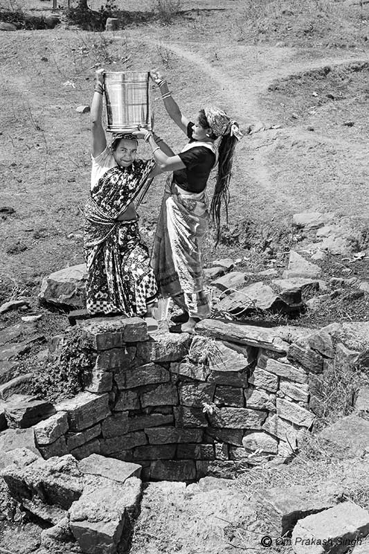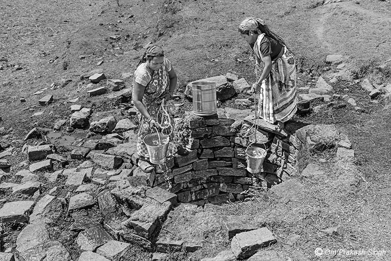 Girls hauling drinking water from a distant traditional source in Khunti district