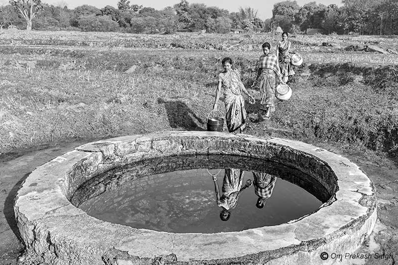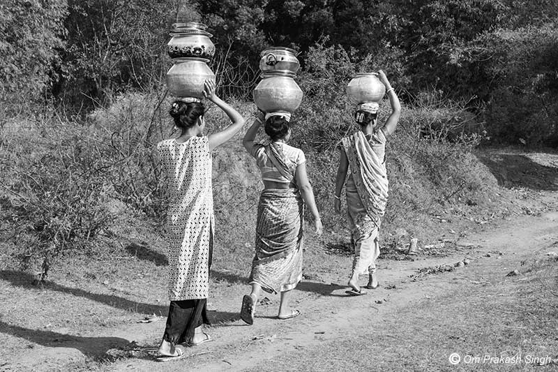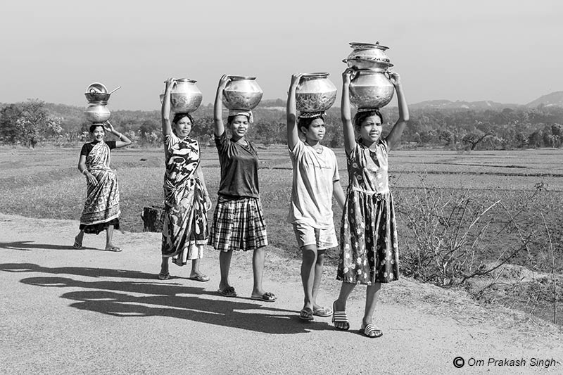 Heading home with headloads of drinking water from a distant traditional spring-based source in Khunti district