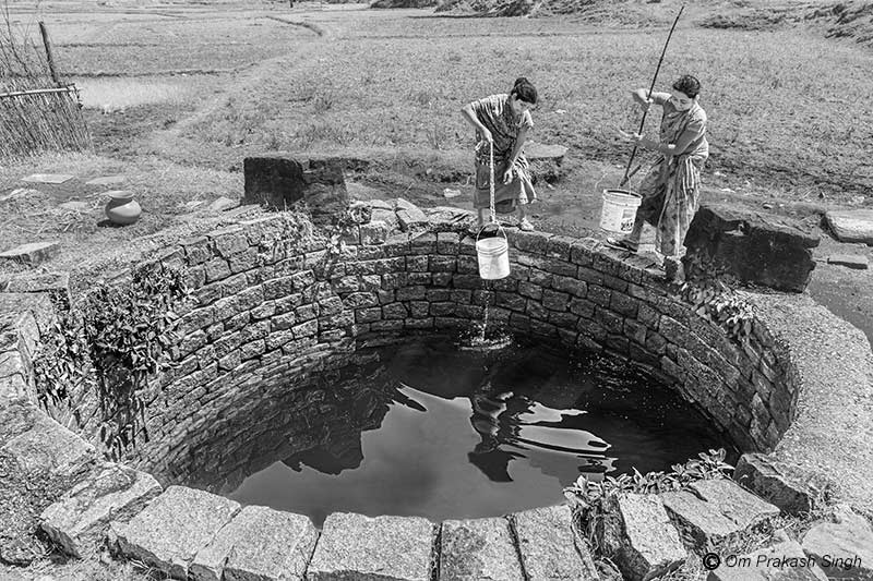 This photo shows women taking water from a community well in a hamlet inhabited by members of a Particularly Vulnerable Tribal Group (PVTG). Here all the criteria determining the ‘functionality’ of FHTCs at home are currently unmet. The SVS in this settlement became inoperative a few months ago due to collapse of the open well that served as its water source. As a result, women and girls are now compelled to rely on this well, which was originally developed as a drinking water source for the childcare center (Anganwadi) by deepening and lining a spring-fed traditional source. Unfortunately, after the implementation of the SVS in the hamlet, this well became neglected, leading to the deterioration of its walls. This condition makes pulling water from the well particularly dangerous, yet women have little choice but to do so.