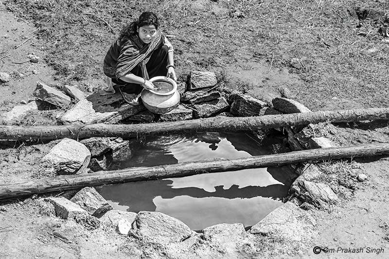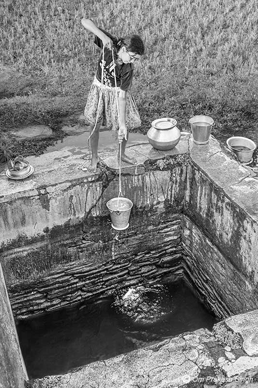A young girl procuring water from a Paata Daarhi situated in paddy fields in Khunti district