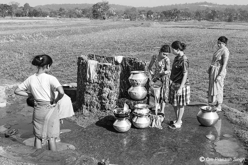 Preparing to collect drinking water from a spring-based traditional source located amidst distant paddy fields in Khunti district