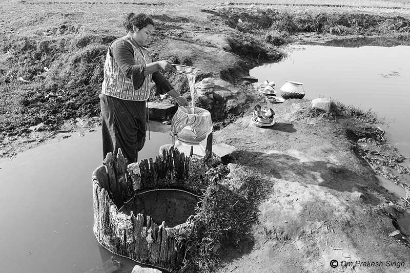 Procuring drinking water from an old damaged Kukuru Daarhi in Khunti district