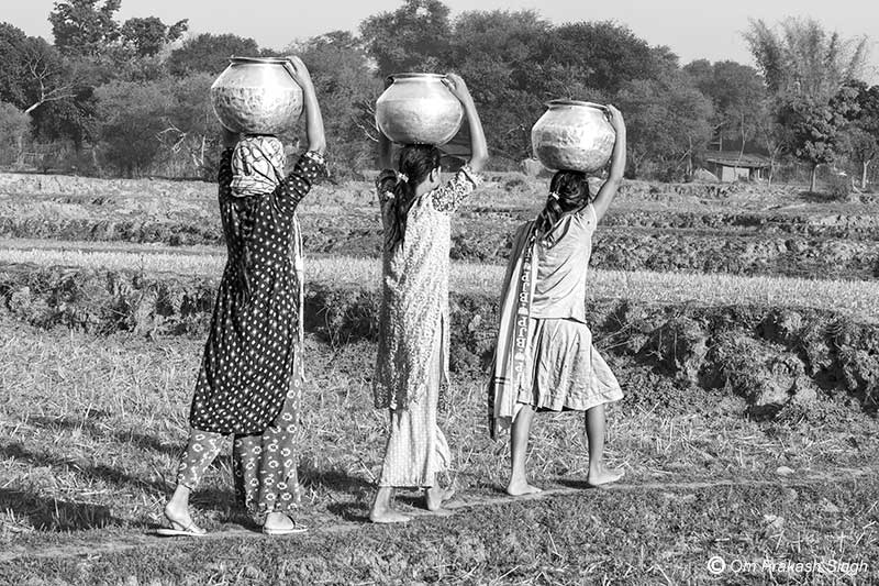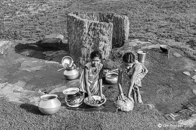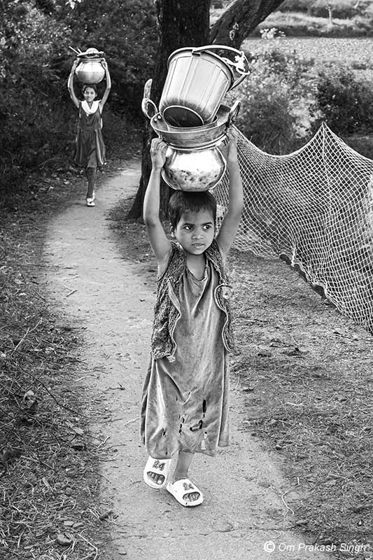 Even very young girls are not spared from the burden of domestic water management. The photo shows a 7-year-old girl who regularly accompanies her elder sister to the Paata Daarhi closer to their hamlet. She helps by carrying home the cleaned utensils and drinking water in a smaller pot. The elder sister, seen in the background, hauls water in a larger pot.