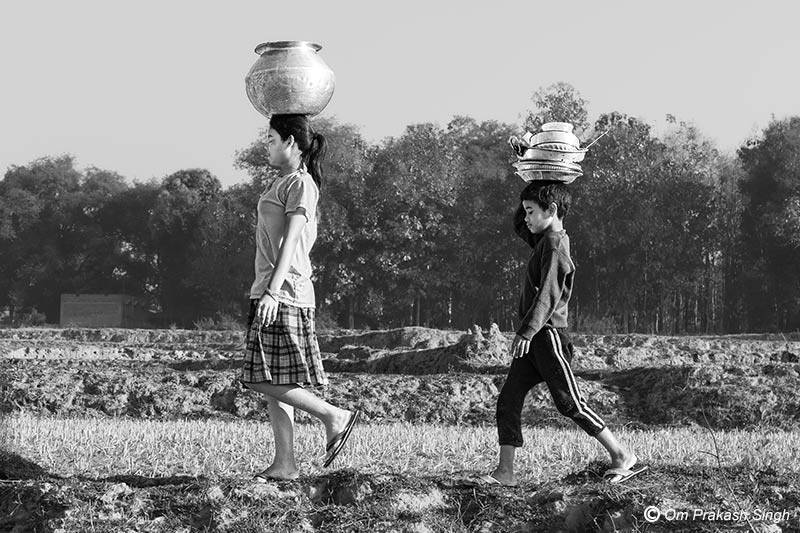 Children returning home from a traditional spring source with headloads of water and cleaned utensils across agricultural fields in Khunti district