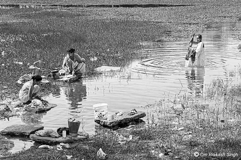 Washing the day’s clothes at a pond located on the village outskirts in Seraikela-Kharsawan district
