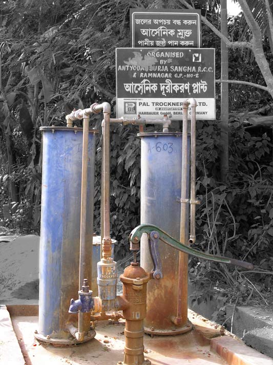 West Bengal (W.B.) was the first state in India where high arsenic in groundwater was detected in 1982, being much above the permissible limit of 0.05 mg/l, as per Indian standard. As a mitigation measure, more than 5000 community-based arsenic treatment units (ATU) have been installed by the government in the affected rural habitations, mostly as handpump-attached units. The photo shows one such ATU produced by Pal-Trockner that uses granular ferric oxide as the treatment media. However this technology, along with many others that were either imported or developed in India, became defunct in a few months after installation due to various technical and maintenance problems. The brown stains outside the ATU in this photo indicate the high concentration of iron in the groundwater alongside arsenic, which necessitates regular backwashing which is a cumbersome exercise for the users, besides the need of regular surveillance of water quality and change of spent media. Consequently, the ATU has been lying inoperational since long. After several decades, presently 778 rural habitations in 8 districts are reported as arsenic-affected, with more than 1.2 million population yet to be 'covered' with safe drinking water provision.