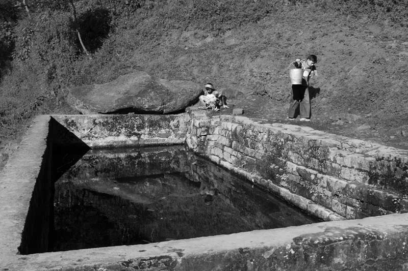 This photo depicts the same spring-fed tank shown before, presenting the situation when the spring discharge diminishes after the monsoon, leading to disappearance of the water, and consequently causing great hardships to the people. The spring discharge reduces drastically, necessitating scooping out the water with a mug, which makes water procurement a time-taking process. Moreover, even after the long-drawn exercise, the water collected may not be sufficient and the quality also be undermined.
