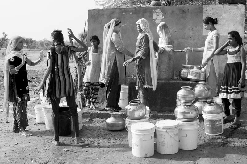According to recent government statistics, 466 rural habitations in Maharashtra are quality affected, of which 151 are affected by salinity. The village portrayed in the photo is salinity-affected, with no safe drinking water source. As a result people are dependent on weekly drinking water supply from government water tankers, which fill large tanks kept along the main motorable road near the village. Women have to carry water home manually in smaller containers as and when required. People often complain that the quality of the water delivered by the tanker does not reach up to their quality aspirations. Further, since these tanks lie in the open along the motorable road, the water is exposed to dust and other suspended particles that pollute the water. However, despite the quality limitations, in the absence of any other option, villagers are forced to use this water for drinking.