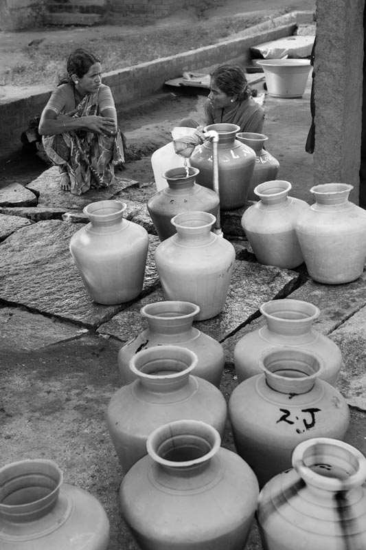 Waiting for the water trickle to fill the pitcher in a rural habitation in district Kolar, Karnataka