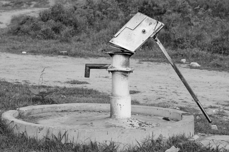A heavy-duty handpump perched on the Himalayan slopes near a village in Tehri Garhwal district, Uttarakhand