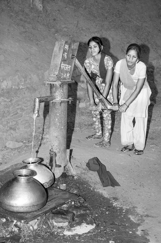 In Uttarakhand, access to drinking water is a significant problem, as with increasing deforestation, rising population and changing land use patterns, springs emerging on the Himalayan slopes that used to earlier supply drinking water to rural communities are drying up. To mitigate the problem, the government has installed handpumps along roads near villages. However, this is not a sustainable intervention. Not only are there quality problems with the water smelling of iron, but more importantly, the yield of these handpumps progressively decreases after the monsoon season. In the lean season, as the water table drops sharply, the pumping becomes increasingly harder, some of them ultimately drying up. This entirely defeats the purpose of the installation and the expenditure incurred in the process. The handpump shown in this photo is so 'heavy-duty' that even after combined pumping by two girls together, it barely yields a trickle of water.