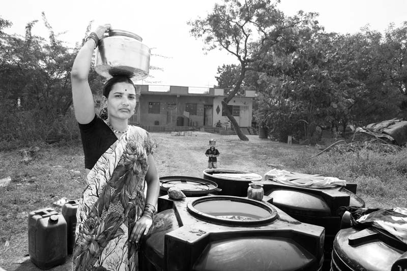Carrying drinking water home from filled tanks stored along the roadside in a village in Ahmednagar district, Maharashtra