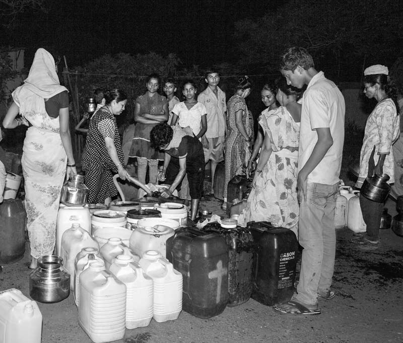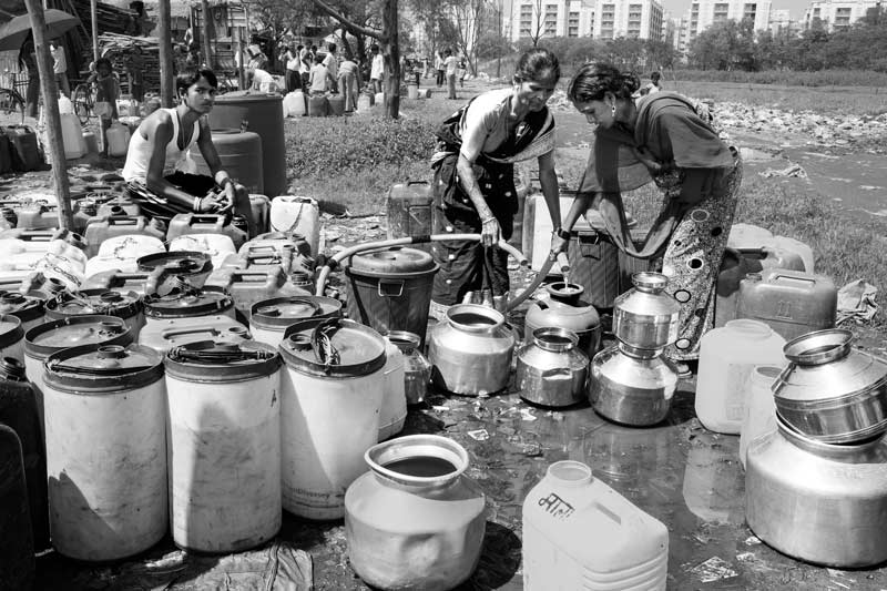 Struggling to fill long queues of containers with little water at low pressure at a group connection in Mumbai, Maharashtra