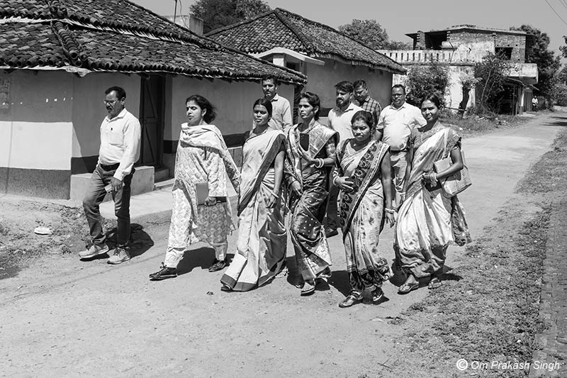 Women VWSC members marching ahead to show a JJM scheme to one of the authors in Seraikela Kharsawan district