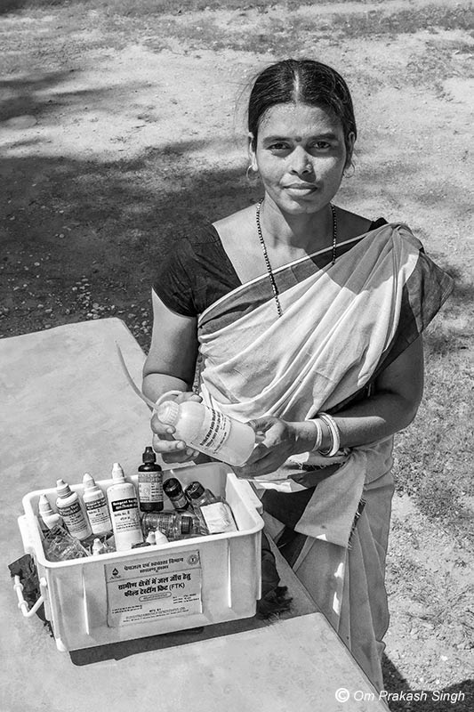 A Jal Sahiya demonstrates the field test kit that she uses for village drinking water quality monitoring in Seraikela Kharsawan district