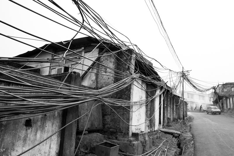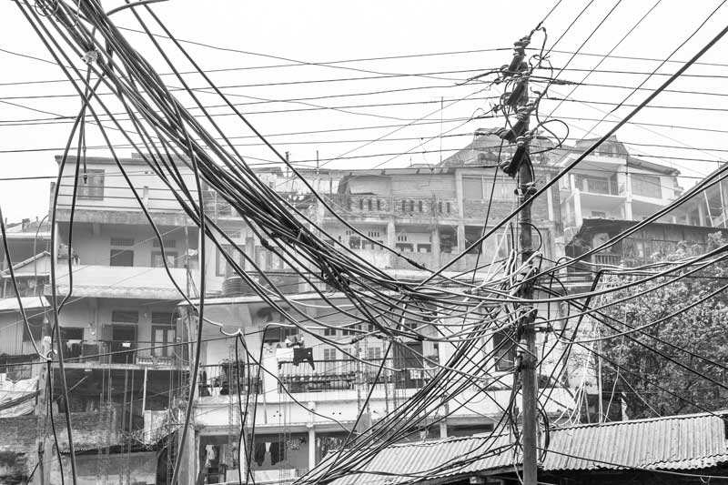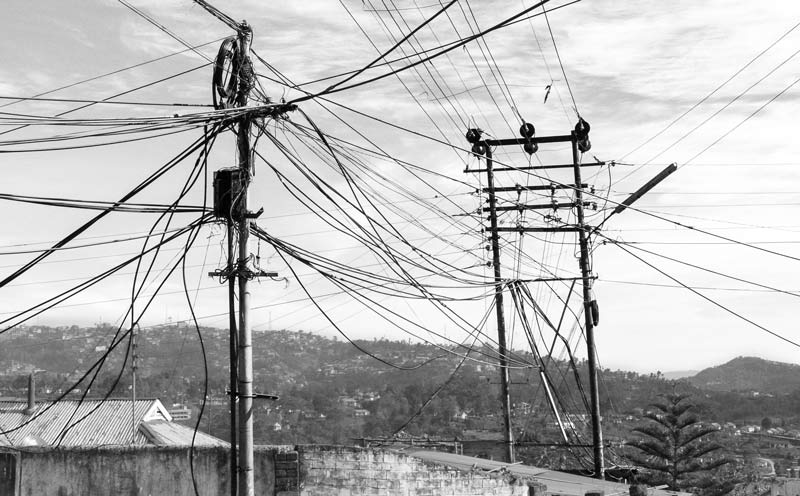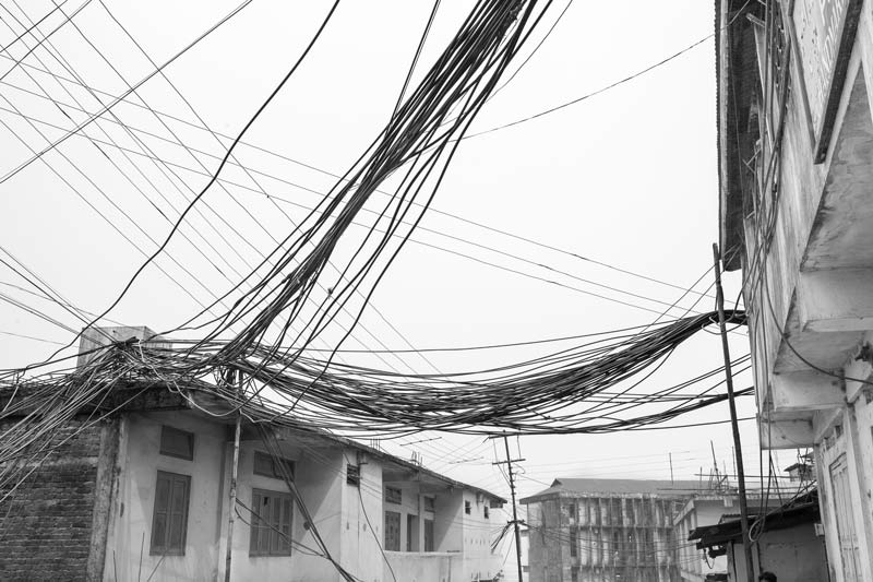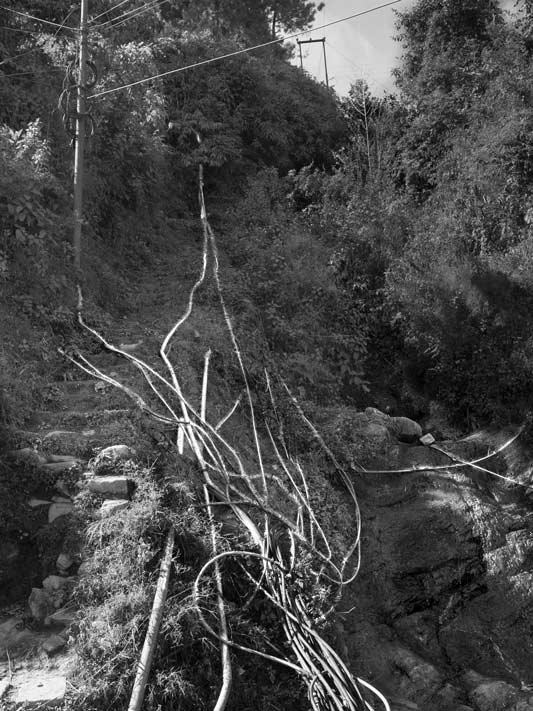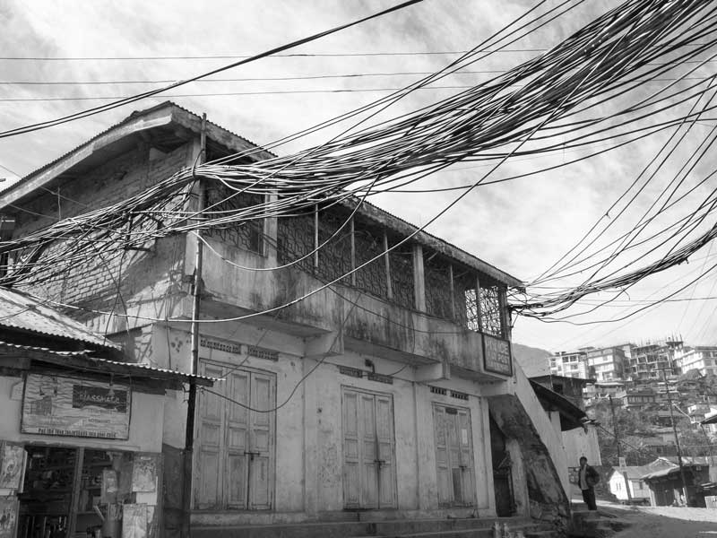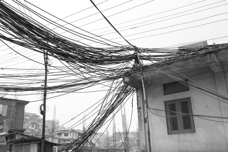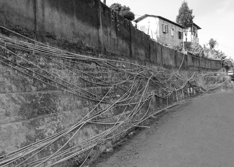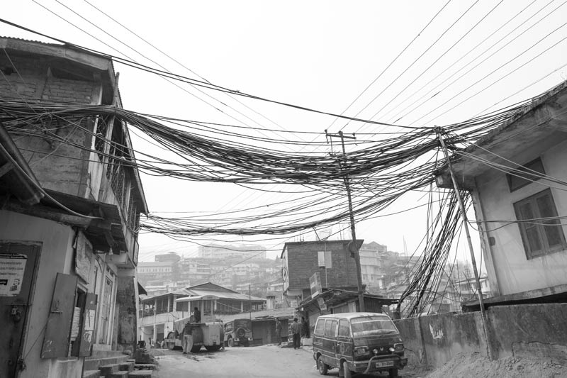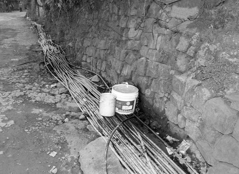 Kohima - the capital of Nagaland - is a hill city in North East India. The average annual rainfall here is high, varying from 1500 mm to 2800 mm, most of which is received during the monsoon season. Despite abundant rainfall, Kohima has been in the grip of water crisis since long. Only about 40% population is supplied by the government distribution network operated and maintained by the Public Health Engineering Department (PHED), that too at a very low per capita rate. For the remaining population, one of the common alternatives is the expensive private water cable networks that distribute water through thin plastic pipes criss-crossing the city in bunches. There exists no systematic infrastructure to support these cables and these are just bundled together to run along and between buildings and houses, on the sides of streets and motorable roads, or even hung across telephone and electricity poles. The latter entails much risk as water leakage can cause damage to these fundamental services in the city. Despite the cost and risks, even these sources are unreliable because the flow in the source springs become meagre or these dry up completely early in the lean season, thanks to large-scale deforestation in and around the city for construction, logging and agriculture. This forces citizens to spend even more for water, buying water from private water tankers which is equally expensive. On an average, a family of five-six members may thus spend anything from Rs 2000 to Rs 3000 towards water bills alone in a month. Some houses may have rainwater harvesting structures to support their water needs. Given this scenario, it is more than evident that the human right to water of the city’s populace is in great jeopardy. Women are unable to efficiently undertake their domestic daily chores that essentially require water. Health and hygiene of the family suffers, in turn affecting monthly expenditures, physical capabilities, livelihoods and children’s education. Though some interventions such as tapping additional rivers and streams for augmenting city’s water supply are being undertaken by PHED, the pertinent question is: what is a sustainable solution for this hill city and many others in the region, also considering the impact of climate change? This photo story presents different facets of the cable water supply in Kohima, further highlighting the need to develop sustainable water supply alternatives for the hill cities and towns of India. The title photo shows a bunch of water cables running across a long row of houses in one of the localities of Kohima.