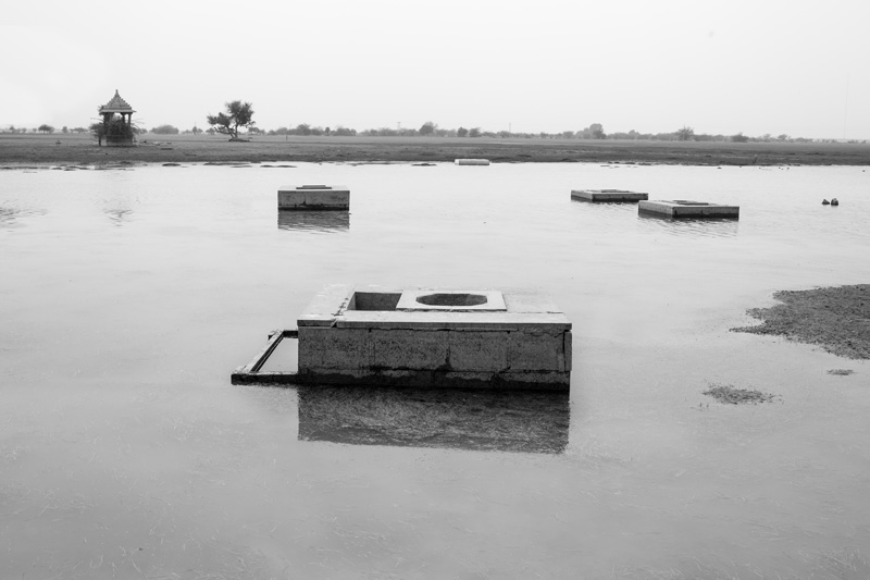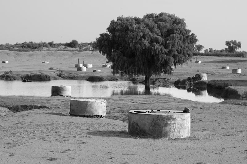 A rainfed pond having shallow wells inside, used for drinking water supply round the year in the arid Thar Desert in Jaisalmer district, Rajasthan