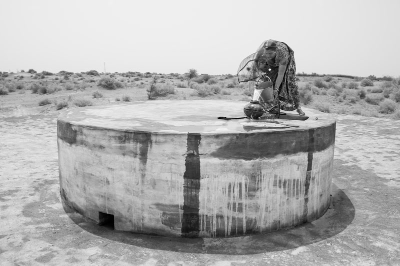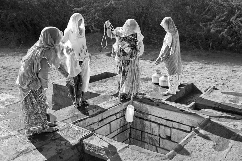 A shallow well (beri) recharged by an adjacent khadin used by women for procuring drinking water in Jaisalmer district, Rajasthan