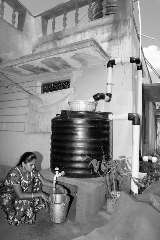 Rainwater harvested from the roof being withdrawn for drinking and cooking purposes in Chikkaballapur district, Karnataka