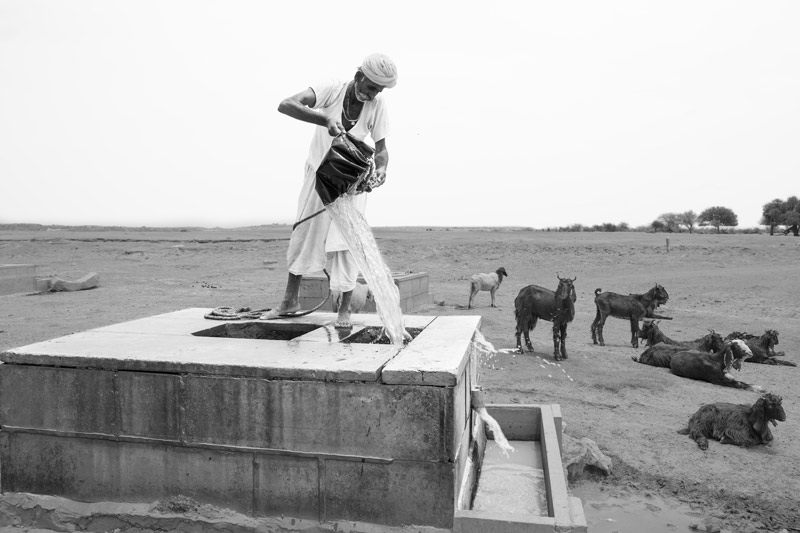 Water from 'beri' being transferred into the ‘kheli’ from where animals can drink