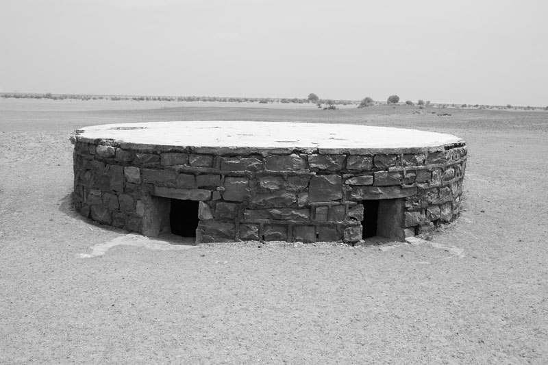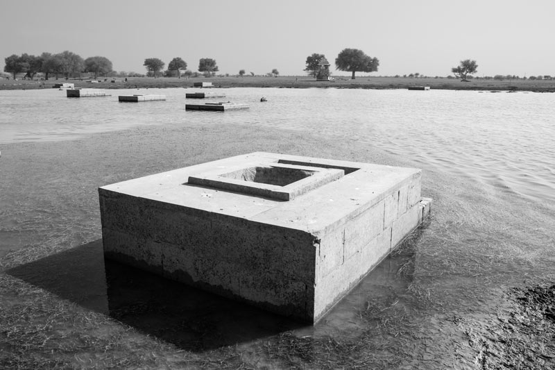 In the western part of India is located the Thar Desert, also known as the Great Indian Desert, which is characterized by aridity with scanty precipitation, sandy soil and dry air. At the heart of Thar Desert lies Jaisalmer district of Rajasthan where the erstwhile tehsil (sub-district) Ramgarh is located. This area, characterized by vast stretches of sand dunes, is the driest place of India where the climate is hyper-arid, with temperature up to 48°Celsius during summers and average annual rainfall not exceeding 100 mm. The rain is often erratic and received largely during the monsoon months of July to September. Further, droughts due to failure of rainfall are not infrequent and rivers and streams are conspicuous by their absence. The water table is very deep, more than 65 m, and the groundwater is not only saline but at some places also contains fluoride above the permissible limit of 1.5 mg/l. In these circumstances, sustainable access to safe drinking water could be a great challenge for the people who inhabit the region. However, for centuries the inhabitants of this place have been dependent upon a nature-based solution for quenching their thirst. They have valued rainwater as the most precious resource and attempted to catch every drop of it using simple, time-tested, and reliable techniques based on traditional knowledge and local resources. These rainwater harvesting techniques have provided them water security for drinking as well as livelihood and other uses, helping them thrive in a hostile climate with extreme variability. This photo story aims to demystify how women, men and children quench their thirst through rainwater harvesting in Ramgarh region. It sets out to describe the case of Netsi, a medium-sized village in the area, spread over an area of 168 sq. km., and located about 73 km north-west from the district headquarter Jaisalmer. As per Population Census of 2011, the village is inhabited by 967 individuals living in 168 households, with animal husbandry and agriculture as the main modes of livelihood. According to local residents, the village is well-known in the area for its huge pond called Viprasar which holds rainwater (‘palar pani’) during years having good monsoon rains, and always provides percolated shallow groundwater (‘rejwani pani’) through small shallow wells called ‘beris’, even during the drought years. The surface and shallow groundwater together provide sweet and safe drinking water to the villagers round the year, irrespective of the climatic pressures. The title photo shows beris visible in the receding waters of Viprasar during the spring season.