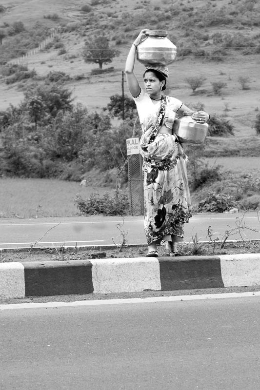 A pregnant rural woman carrying multiple loads of drinking water from a well across a busy motorable highway in Nashik district, Maharashtra