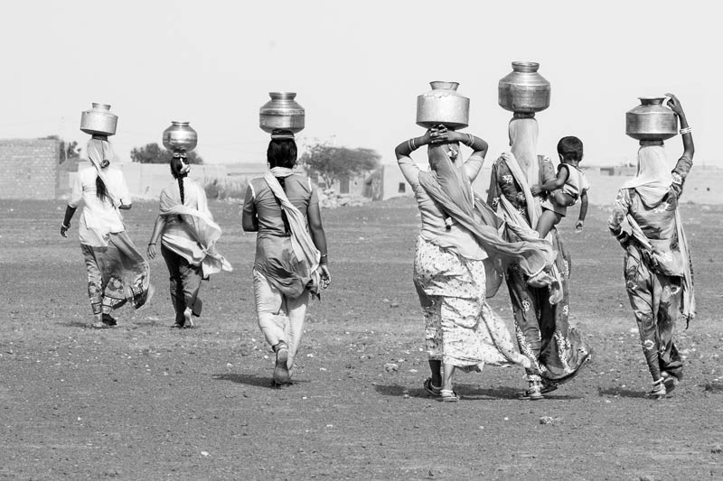 Women carrying drinking water in the scorching sun from a distant source in Thar Desert, Jaisalmer district, Rajasthan