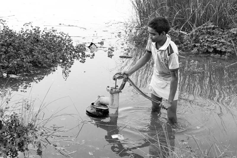 Taking unsafe drinking water from a handpump submerged under flood waters in Bhojpur district, Bihar
