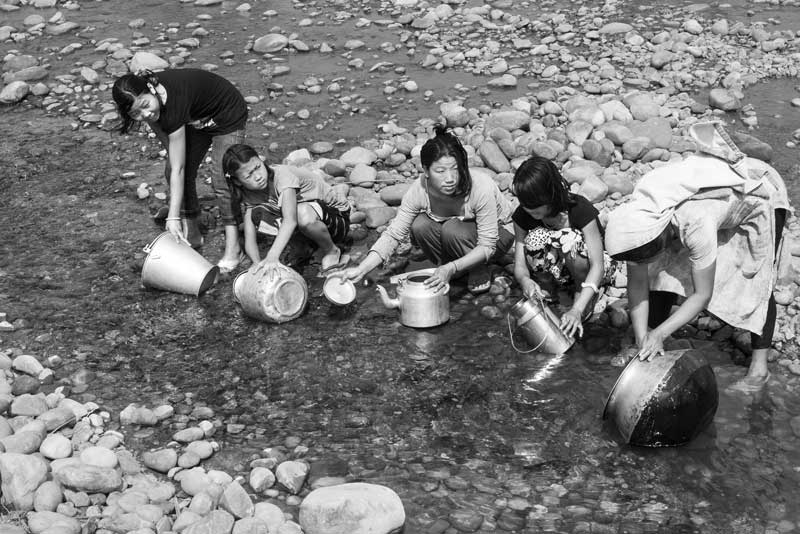 Fetching water from a mountainous river in East Siyang district, Arunachal Pradesh