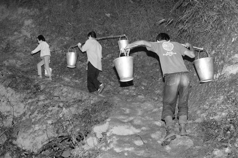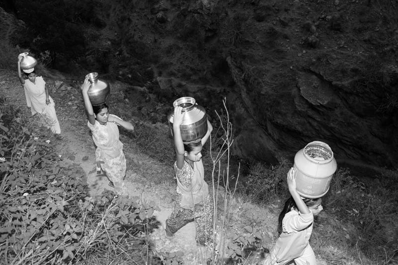 Carrying drinking water collected from a distant spring located down the slopes of Himalayan mountains in Tehri Garhwal district, Uttarakhand