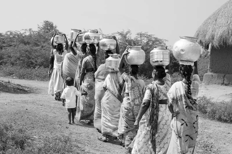 In Kutch district of Gujarat, groundwater as well as the soil is highly saline. As a result, water in the village wells is often saline. In the absence of any other water source, people are forced to fetch drinking water from sources based on rainwater. In this photo, women are seen collecting drinking water from a distant small shallow pond near the agricultural fields. Since the pond is recharged with rainwater, the water is sweet but it may be biologically as well as chemically unsafe, by virtue of being open and unprotected which can make the water contaminated due to agricultural runoff, animals, and other sources.