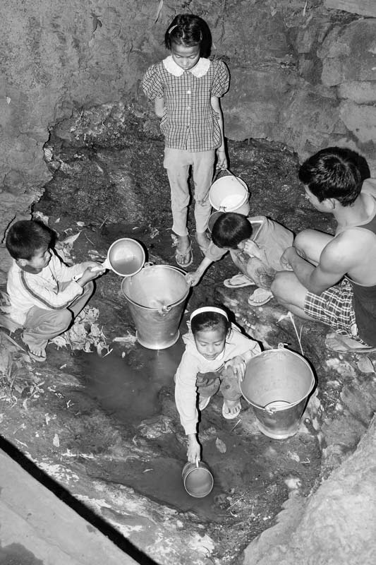 Scooping out scanty drinking water from an unprotected spring in Zunheboto district, Nagaland