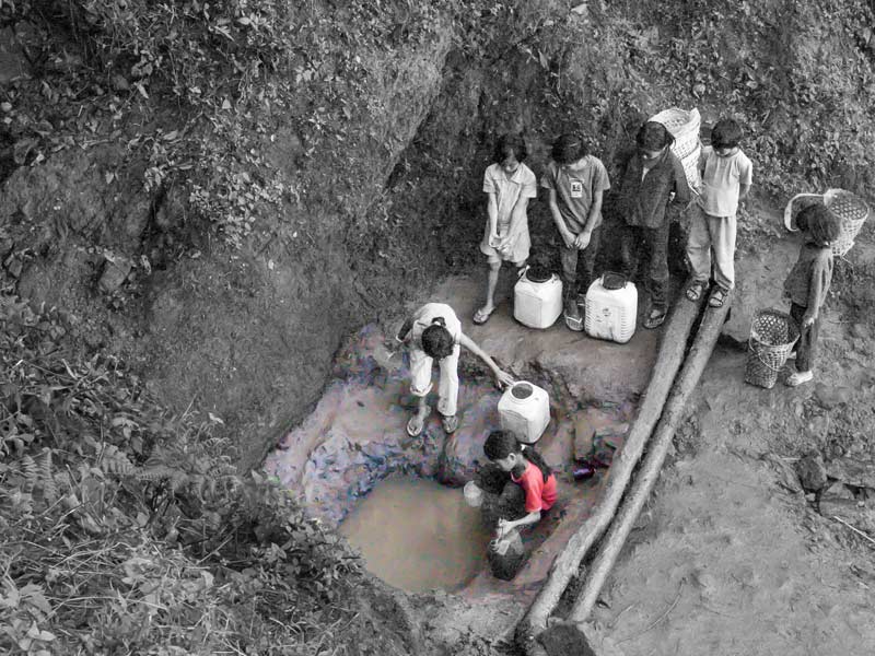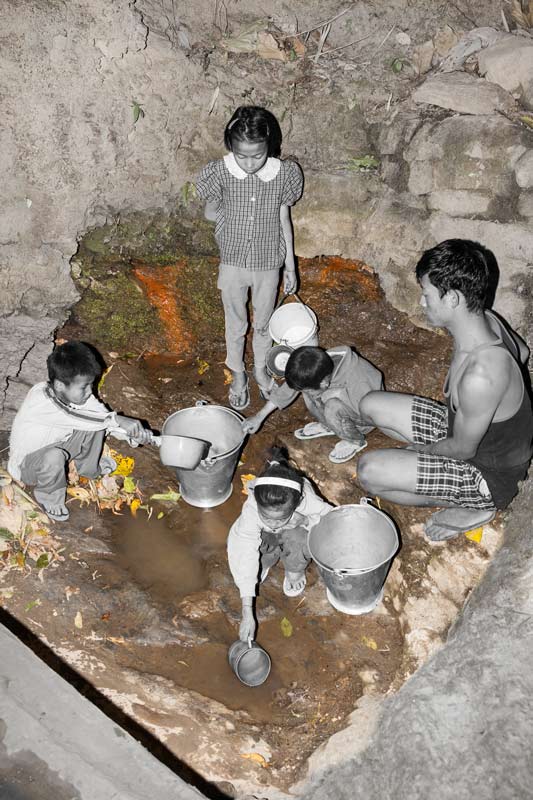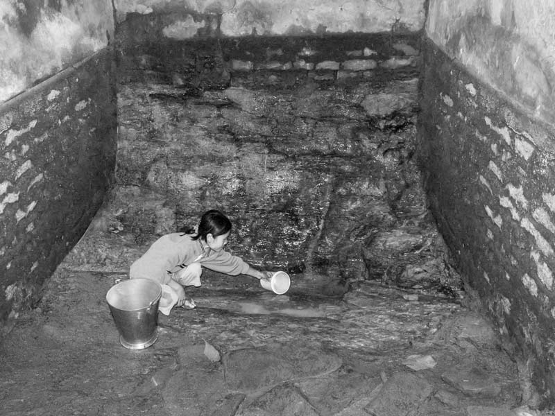 As noted before, spring-fed water sources recharge slowly. Thus, in the morning, these may be holding larger water stores, which gets depleted as the day progresses, with people regularly coming to procure water. The spring-fed source shown in the previous photo has a small capacity and by the evening, it gets almost exhausted so that people start tramping inside its base in a bid to pick up the little remaining water as is shown to be done by the children. Further, they have entered inside with footwear on which adds to the pollution in the pool and degrades the quality of the water they collect. Thus, both 'availability' and 'safety' norms under the human right to water framework get thwarted.
