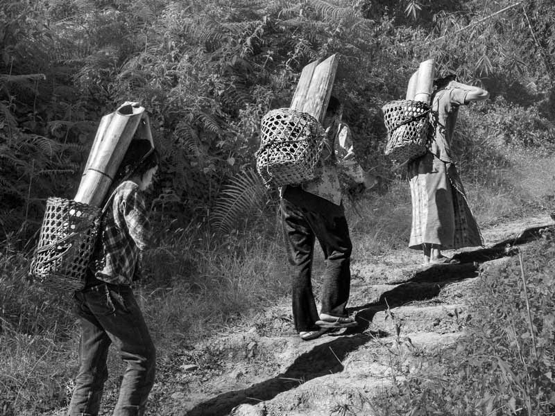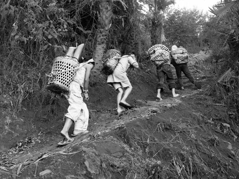 Children carrying heavy water loads up a hilly track in Tuensang district