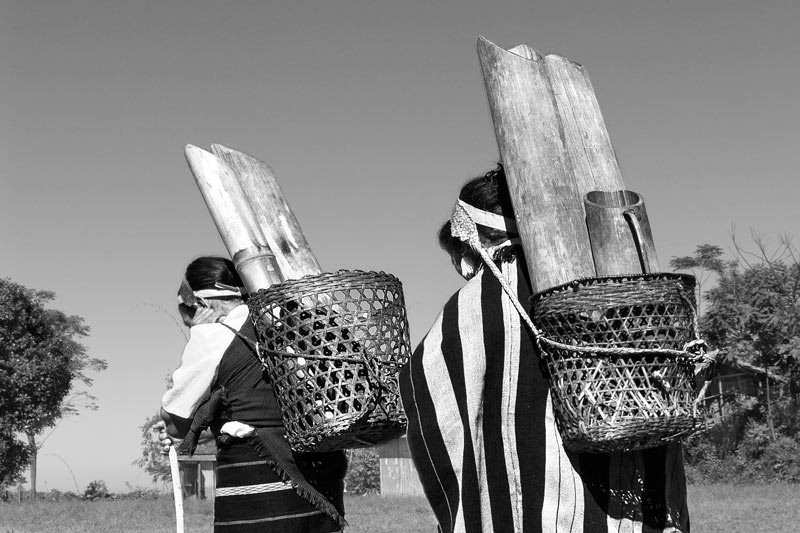 The UN 2030 Agenda for Sustainable Development (2015) obliges governments to ensure that no one is left behind in access to safe and affordable drinking water, which in turn, hinges upon realization of the human right to water. According to the UN framework, the human right to water entitles everyone, without discrimination, to sufficient, safe, acceptable, physically accessible and affordable water for personal and domestic use. The norms and goals set up in India within the scope of this framework have been highlighted in a previous story (16 April 2019), followed by presentations on the status of the right in India (15 May 2019) and in Delhi (15 June 2019) and Mumbai (29 July 2019). The situation in rural India has also been presented through the case of Gujarat (31 August 2019). This photo story aims to explore the status of human right to water in the hilly regions of India, through a focus on Nagaland, a predominantly mountainous state. Recognized as one of the 'Seven Sister States' of northeastern India, Nagaland is tight-packed with north-south aligned ranges defined by steep slopes and narrow valleys. The altitude of the state varies from 100 up to 3,840 m. Rainfall is considerably high, with the average annual varying between 2,000 to 2,500 mm. However, despite the high rainfall, Nagaland's Public Health Engineering Department (PHED) – the agency responsible for supplying water for domestic and personal use – notes that many rural and urban habitations lack viable water sources, and their depletion from the wet to dry season is a common phenomenon. Most water sources in Nagaland are surface water based, such as rivers, streams, springs and ponds, and the supply systems are either gravity-fed or based on pumping. Thus, for a good proportion of the over 1.4 million rural population and the 0.6 million urbanites, 'availability' of water round the year is a significant challenge. Moreover, the PHED's 'coverage' for water supply is low in both rural and urban pockets. According to the 2018-2019 Annual Report of Government of India (GoI), only 51% rural habitations in Nagaland are 'fully covered' with access to 40 liters per capita per day (lpcd) of safe drinking water throughout the year available within 100 m (horizontal/vertical) from the household. Further, in terms of 'physical access', the census of 2011 shows that only about 29% of total households enjoy access to a source within the premises, and a near equal number are dependent on a 'distant' source, which implies traversing a distance of 100 m or more, mostly on hilly terrains. Among rural households, this figure is only 20% while the corresponding figure for urban households is about 50%. As many as one-fifth of urban households report water procurement from 'distant' sources. In terms of piped water supply, while about 47% of total households in the state reported access in 2011, less than 13% of these enjoyed supply from a treated source. The remaining population depend upon other sources such as untreated tapwater, wells, handpumps, tubewells, rivers and springs, where the quality of water delivered may be uncertain. A report from the Comptroller and Auditor General (CAG) of India on Nagaland's Social, Economic, Revenue and General Sectors (2018) further reveals that only 4.9% coverage exists for piped water supply within rural household premises, while according to national standards, the target coverage by 2017 was 35%. The CAG report also notes shortfall in regular monitoring of water quality and prompt action for mitigation wherever needed. Further, information accessibility related to water supply is poor, and insufficient coverage and seasonality of water availability imposes additional financial burden on the urban and rural populace, who may be forced to privately buy water in the absence of regular supplies. Such a scenario throws up important concerns regarding enjoyment of the human right to water in Nagaland, as all the essential norms, namely, availability, safety, physical accessibility, non-discrimination, information accessibility and affordability are significantly thwarted. The photo story delves deeper into the state of enjoyment of these norms in the rural and urban pockets of Nagaland. The title photo depicts women carrying heavy loads of water on the back in traditional bamboo pipe containers in Tuensang district.