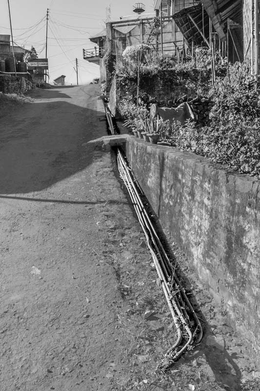 A bunch of private water cables running across a long row of houses in the capital city Kohima