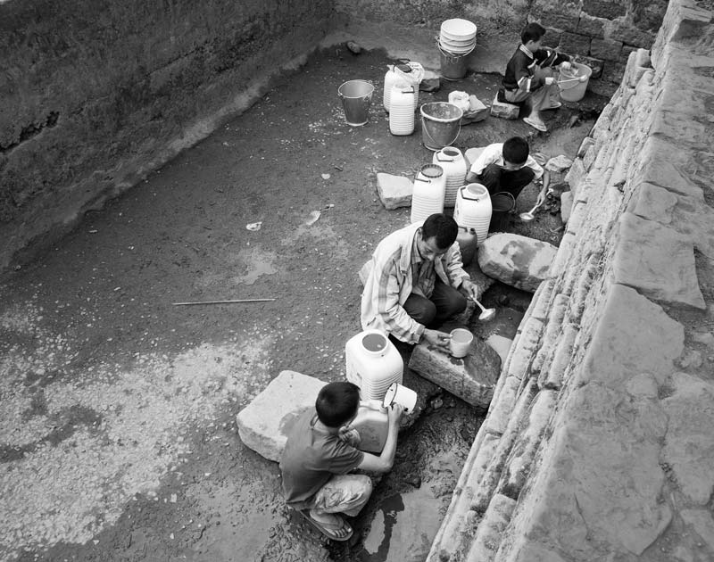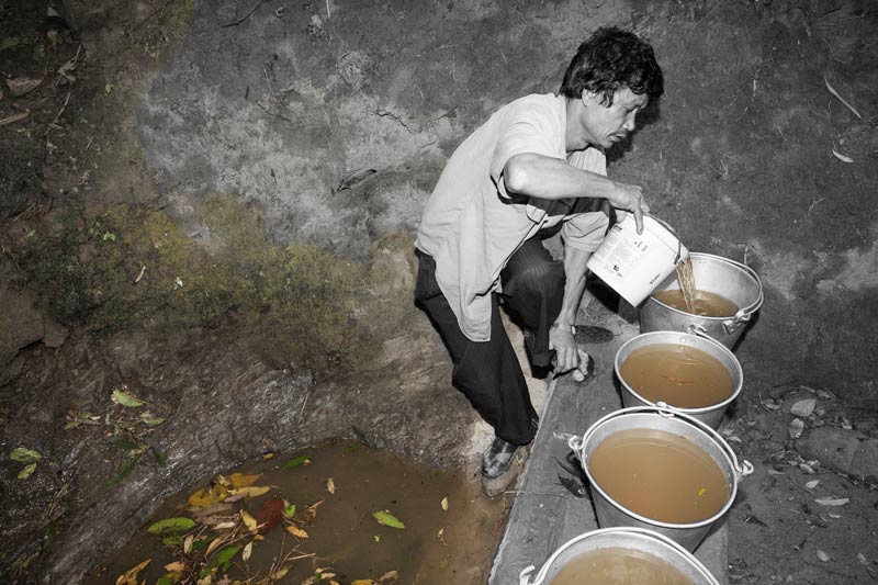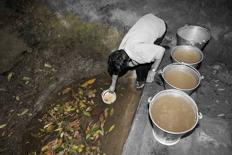'Scooping' water out of a nearly dried protected spring-fed tank in Mokokchung town