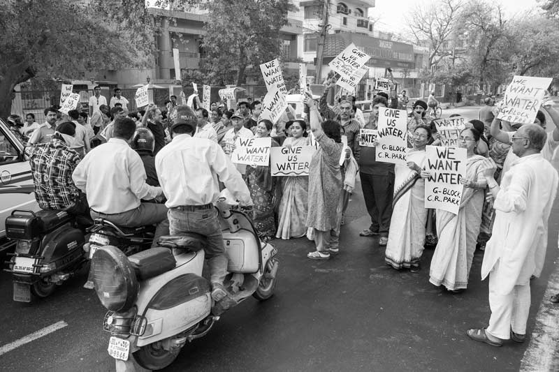 More than 91% of urban households in India are claimed to enjoy the privilege of access to safe drinking water according to the latest Census of 2011. But what kind of access do they enjoy? Over 13.7 million urban households are located in informal colonies or ‘slums’ where basic amenities are inadequate. More than 43% of these households do not possess a drinking water source at home and have to procure drinking water from outside. These outside sources may be public tapstands, group connections, tankers, community handpumps, public wells, or even valves and leakages in water mainlines that pass by close to these colonies. Sometimes the source may be unsafe, exposing women, men and children to risks of ill-health. In other instances, these may be very distant, forcing them to carry water in bulk over long distances, causing hardships and risks of physical injury. The supply timing may be irregular or odd, sometimes late in the night, further increasing the hardships. In colonies served by water tankers, several valuable productive hours may be lost by women and men awaiting their arrival because there exists no punctual routine. All this may lead to reduced incomes as well as disturbed routines at home even for children, who often assist in the task, in turn affecting their education. In many instances, the number of dependent households is large for a single supply point, while the supply duration is short. Further, the pressure in the tap may be too low. All this may often lead to rush and queues, scuffle and struggles, with some even forced to return empty-handed at the end. Even in the formal colonies, the existence of pipeline networks is no guarantee of a safe and secure drinking water supply. Good quality safe drinking water is a challenge in many metropolises and other cities and towns. In the hilly areas, urban water supply may be fed by seasonal springs and streams, causing water distress during the dry months. This photo story presents glimpses of the varied challenges facing urban communities in drinking water procurement in India despite the rosy coverage figures in official records. These challenges undoubtedly thwart enjoyment of the human right to water as well as other concomitant rights by the affected women, men and children. The title photo depicts residents of a posh colony in South-East District of the National Capital Territory of Delhi (NCTD) who are protesting for restoration of their human right to water after several days of disrupted water supply.