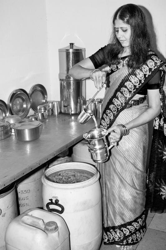 Serving drinking water from the stored weekly ration in a planned colony in Secunderabad, Telangana