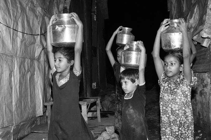 Drinking water is everyone's need at home, and its procurement therefore becomes a cooperative family effort in which even children must contribute. Irrespective of the supply hour, children of all ages and both genders, are often seen carrying water containers in urban areas. In this informal urban settlement, girls are bringing headloads of drinking water collected from a group connection late in the night. Carrying heavy headloads by children on a regular basis poses risks of cervical and spinal injury, retarded growth, and hampers their education and other developmental activities.