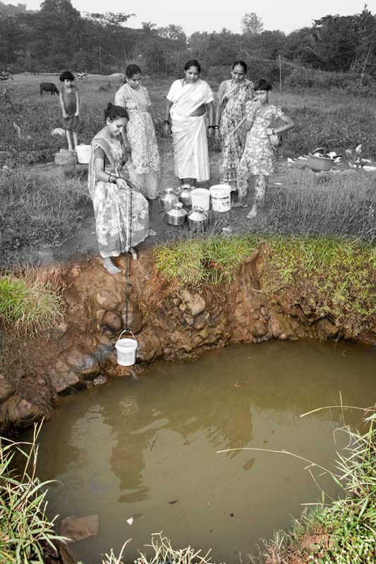 Collecting drinking water from an open well in Mumbai, Maharashtra