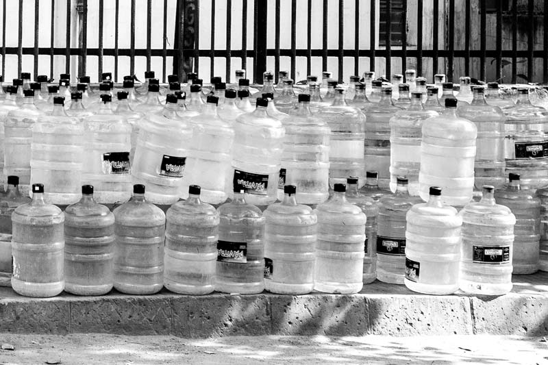 When the drinking water quality is unreliable or the water supply becomes irregular, dependence on bottled water as a drinking water source becomes a compulsion for many. 20 liters water bottles ready for sale in South-East district, National Capital Territory of Delhi