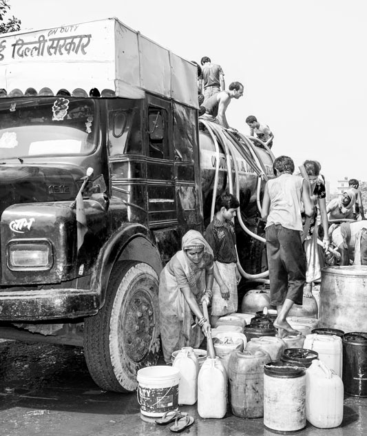 Tankers are a common drinking water source in informal urban colonies where piped water or any other alternative is absent. These are also a source in rural areas when handpumps, wells or springs dry up seasonally. A water tanker in South-East district, National Capital Territory of Delhi