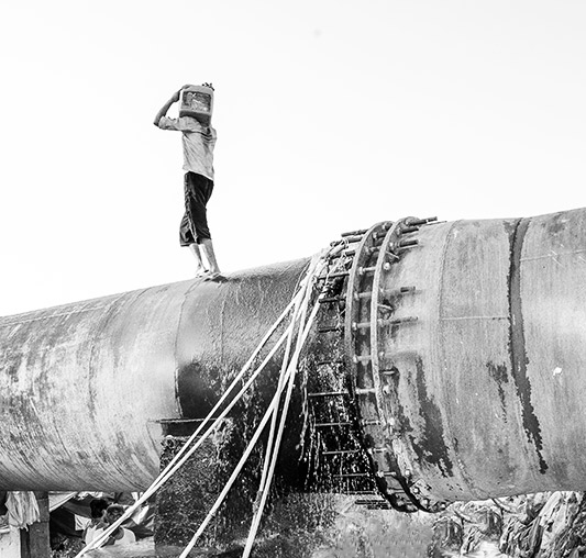 Many a times, leakages at joints between pipes in the main water pipeline passing across settlements serve as drinking water source. The leaking water is collected either directly into containers or through plastic pipes inserted into the leakage – Mumbai, Maharashtra
