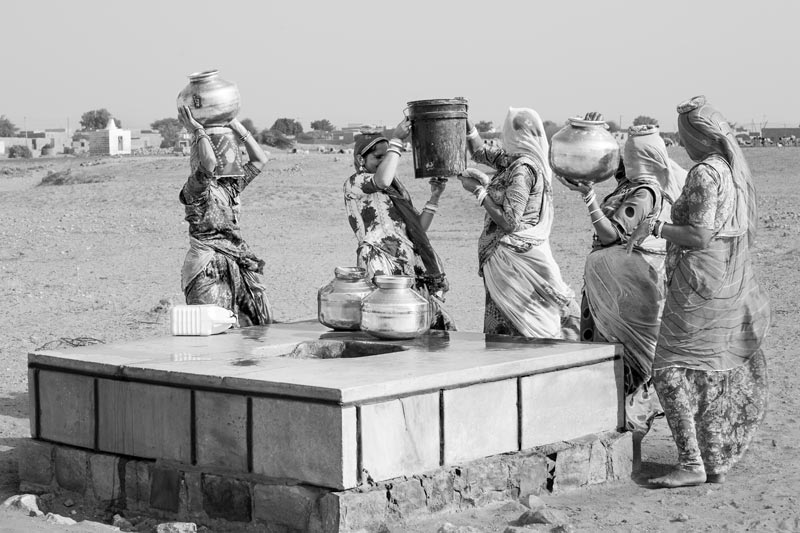Women procuring water from a rejuvenated beri in the bed of a rivulet in village Hema