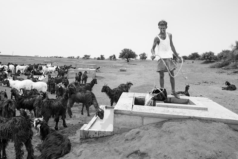 Even the livestock has been facilitated by Chattar Singh’s rainwater harvesting interventions. Every rejuvenated beri has a shallow tank attached to it into which water from the beri can be poured for the livestock. This tank is called ‘kheli’ and animals are able to conveniently drink water here during the dry season when surface water ponds start disappearing. The large livestock population of more than 16,000 in Netsi village, comprising of sheep, goat, cattle and camel, is highly dependent on these khelis, one of which is shown in the photo above.