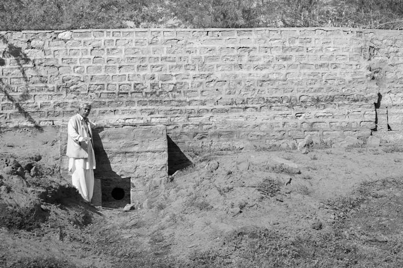 Every khadin has a pillar called goedhan which is used for measuring the water level during inundation. In the above photo, Chattar Singh is indicating the comparative water levels achieved during the previous monsoon periods.
