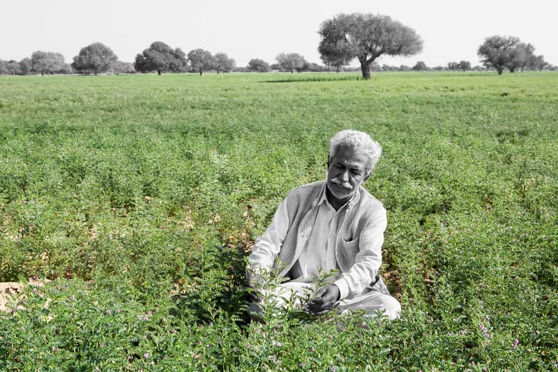A Bhil farmer standing amidst gram crop growing in his khadin