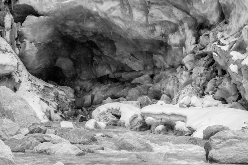 The snout or terminus of Gangotri glacier is known as 'Gaumukh', which literally means "Mouth of a Cow", a name attributed by virtue of its shape. Located at an altitude of about 3950 m, Gaumukh consists of a 40 m high ice wall and a large ice cave measuring about 30 m wide and 20 m high. Melt water gushing out of the snout gives rise to the Bhagirathi River, which is the main headwaters of the sacred river Ganges. Maximum melting takes place during the period between May and October. Near the snout front, the Bhagirathi river valley is nearly one kilometer in width. As the source of origin of Ganges, Gaumukh is an important pilgrimage site. Despite its name, the shape of Gaumukh actually varies continuously due to glacier movements and alterations in the environmental conditions. Among the latest changes was that in July 2016, when following heavy rains, a large chunk of the glacier at the terminus collapsed and got washed away, flattening the front of the snout. The photo shown above depicts Gaumukh as it appeared in 2010.
