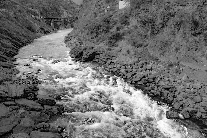 The Bhagirathi river originates at Gaumukh and its basin is fed by 238 glaciers, covering an area of 755 sq.km. Of the various glaciers feeding it, Gangotri is the largest. Bhagirathi is a turbulent river that flows from Gaumukh for 205 km before meeting the Alaknanda River downstream. Though at its point of origin at Gaumukh, the river width is only about one kilometer, along its course, it is joined by several tributaries, namely, Kedar Ganga at Gangotri, Jadh Ganga at Bhaironghati, Kakora Gad and Jalandhari Gad near Harsil, Siyan Gad near Jhala, Asi Ganga near Uttarkashi, and Bhilangna near Old Tehri, enhancing its volume and width.